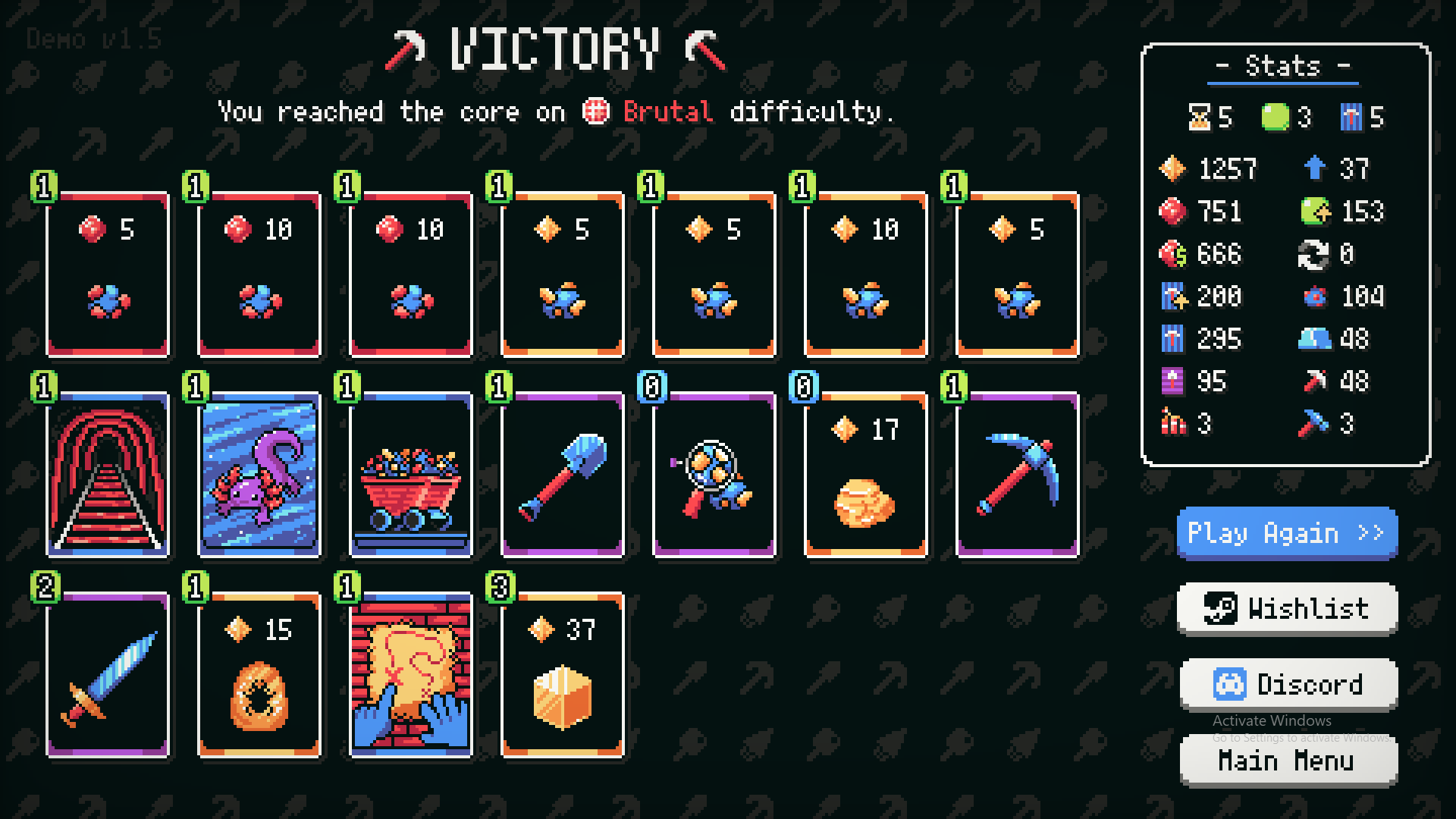 e.g. won like this multple times - after wrenches, axes still dominate the game due to balancing issues (better to be able to shoot through the deck fast, since the game doesnt let you keep cards in hand and decide when to play them. This is the core balancing problem: player has very little control, so things that make up for the lack of control win much more often)