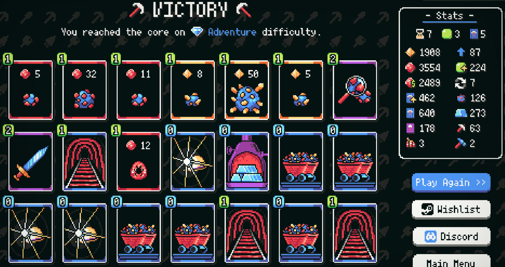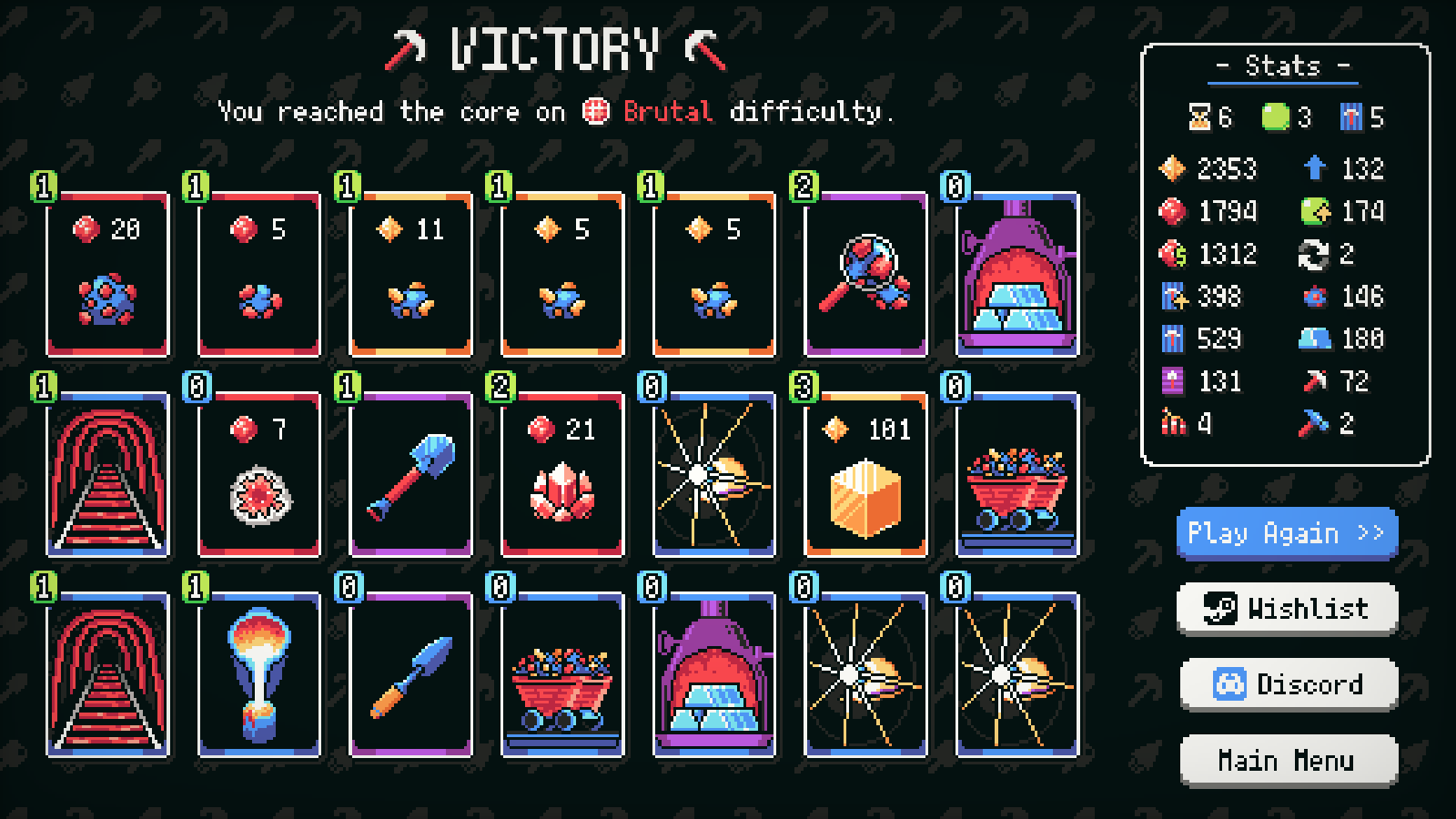 I love this game but for some reason the full screen option doesn't exist for me this meant that my winning screenshot doesn't have my ore amount ore score amount. I won brutal purely based on only using "zero effect" cards: ingot, helmet, minecart, mineshaft (with enough of the other ones), and being basically capable of cycling through my whole deck each turn. I was done with 2 turns left on the core.